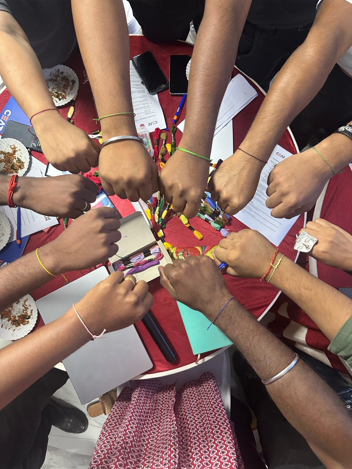 The journey began with a deep dive into the context of the project. Our goal was to understand not just the site but the ecosystem around it—the people working within the plant and those living in nearby villages and towns. We conducted a study of the physical site and held workshops with plant employees, ranging from machine operators to senior management. These sessions explored the concept of "place identity" and delved into aspirations, ideas, and challenges, focusing on themes like community engagement, identity development, and physical space. To immerse ourselves further, we visited nearby villages to engage with local communities. Stops included the women’s toilets refurbished by the RPG Foundation and the Aari embroidery workshop in Kannanthangal village, where women are upskilled to create intricate designs. We also traveled to Kanchipuram, the historic capital of the Pallava dynasty, famous for its temple architecture and silk saris. Here, we observed rituals, visited landmarks like the Kanchi Kailasanathar Temple, enjoyed South Indian cuisine, and attended a Bharatanatyam performance. This immersion helped us uncover the stories, aspirations, and challenges of the people who make up this vibrant ecosystem.
