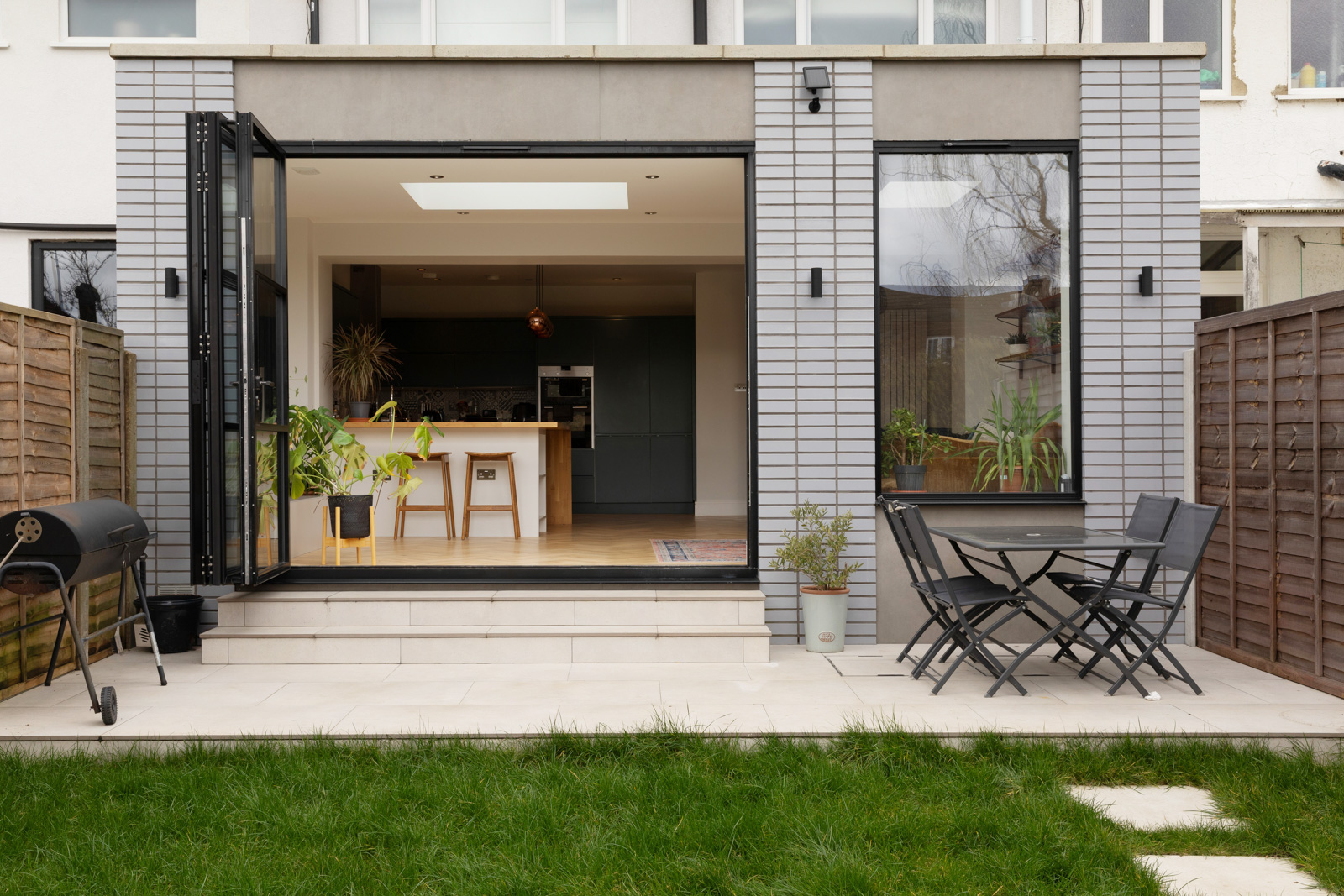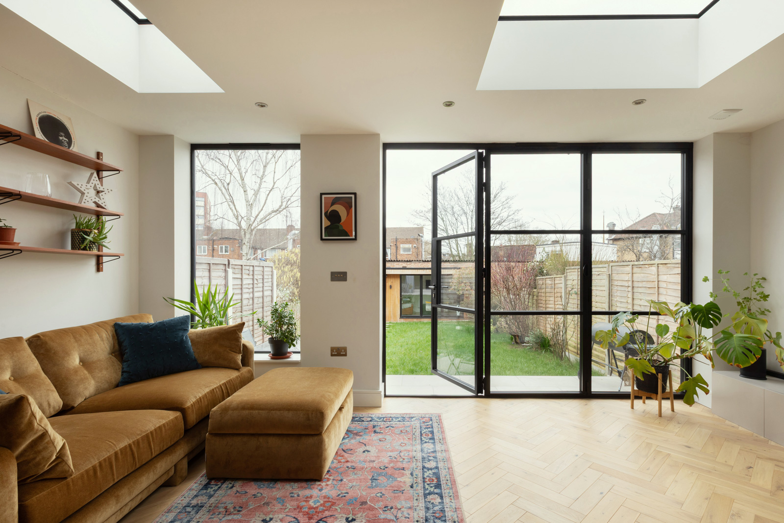 The design expands the existing kitchen to create an open-plan arrangement of kitchen, dining and living areas, enhancing views through the home and strengthening the relationship with the rear garden. The extension create subtle spatial separation while maintaining a continuous flow of natural light. Large doors and an enlarged rear window open the home to the garden, improving both visual connection and day-to-day use. Two rooflights draw additional daylight deep into the plan.