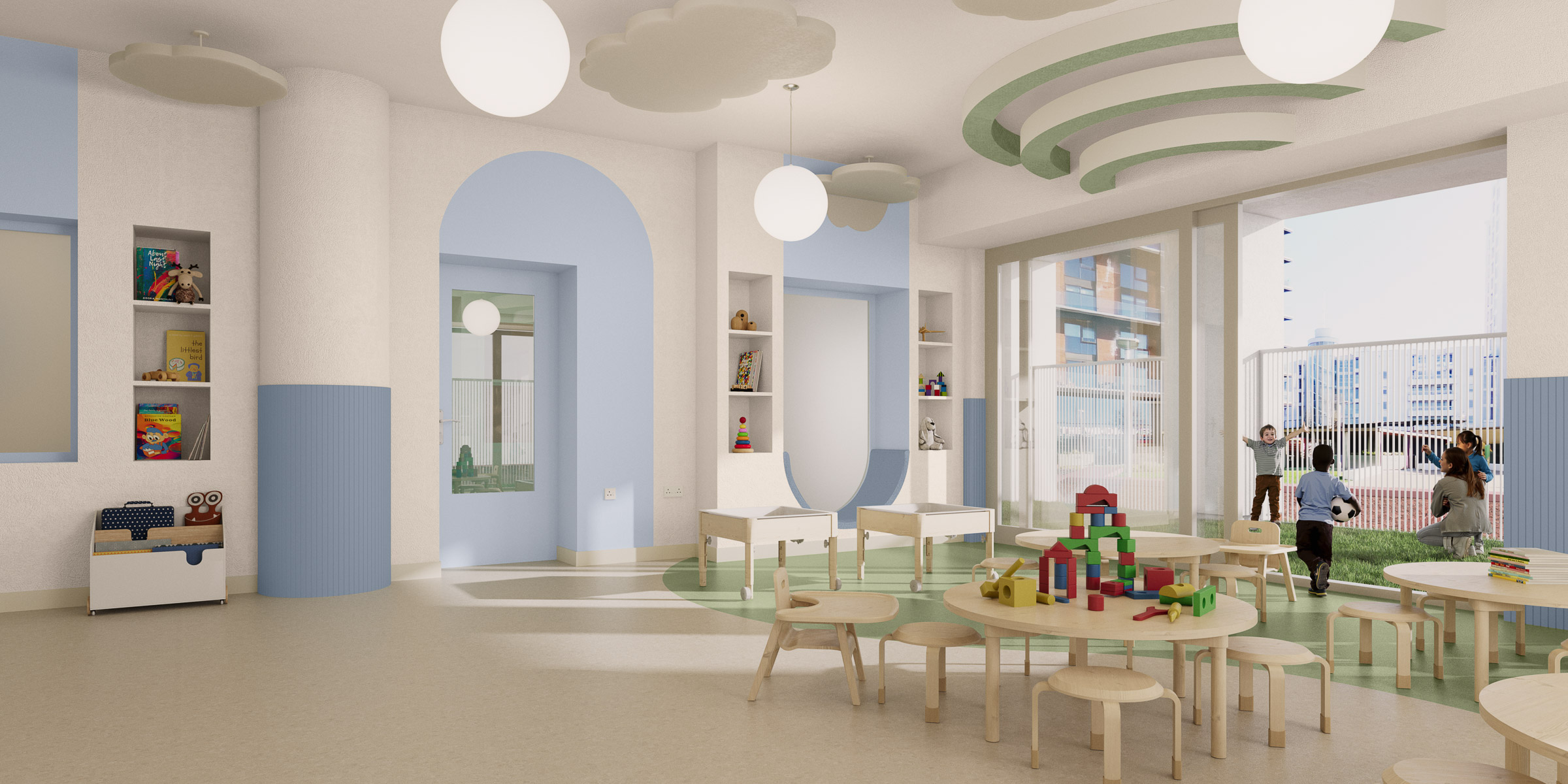 This nursery fit-out in East London has been designed to create a calm, engaging and nurturing environment for early years learning. The spatial concept draws inspiration from nature, combining soft, organic forms with clearer geometric elements to intuitively define areas for play, rest and focused activities.