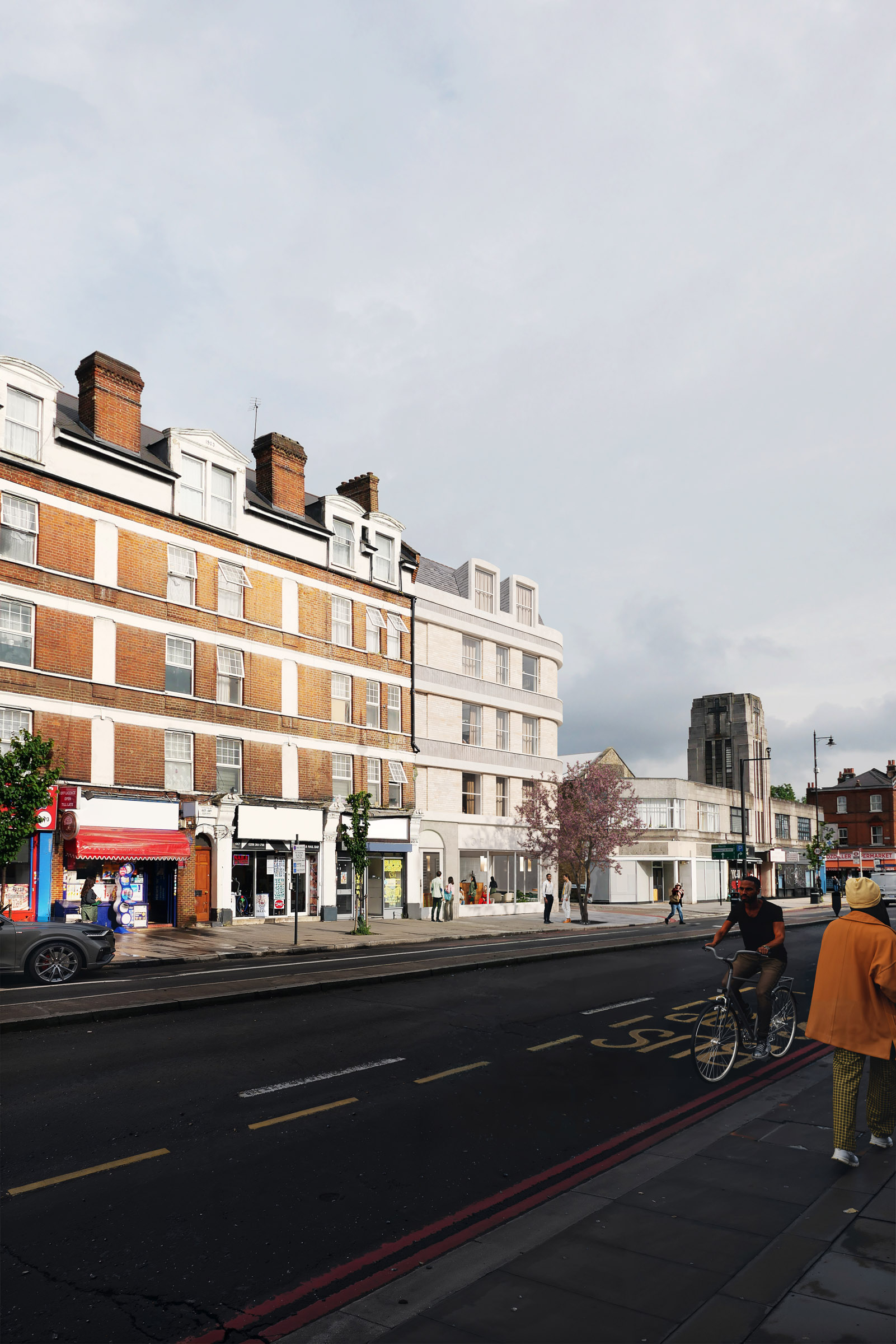 The design responds carefully to its historic context, incorporating articulated setbacks and façade detailing that reflect the scale and rhythm of neighbouring residential buildings.